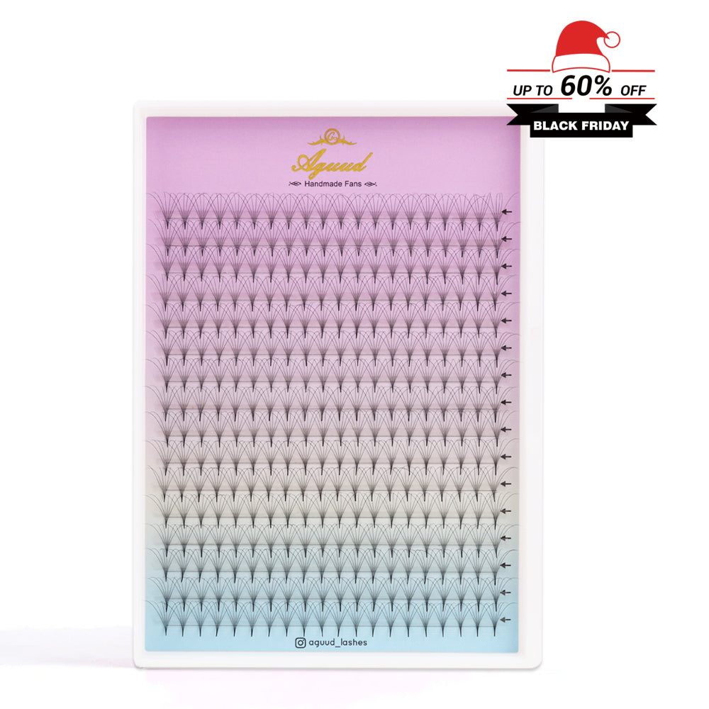 Especificações – Cada bandeja inclui leques pré-fabricados Aguud com base pontiaguda , disponíveis nas curvaturas C/D e em comprimentos variados de 8 a 15 mm . Fabricados com fibras PBT coreanas premium , esses leques são ultramacios, leves e projetados para imitar a textura natural dos cílios reais.